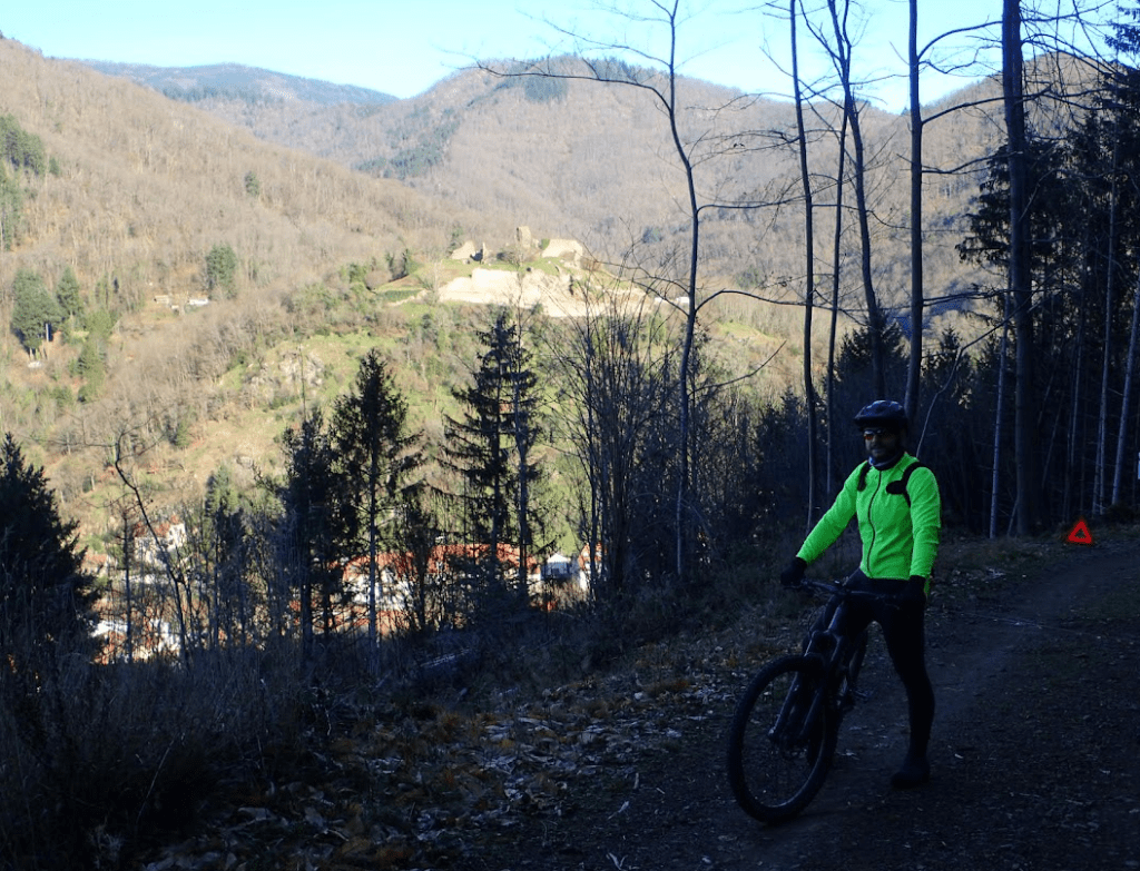 Au col de Teufelsgrund, je prends une ornière cachée sous les feuilles …et boum! Je m’arrête brutalement. J’ai la visière du casque qui tape et les neurones qui s’agitent. Bizarrement en me relevant, j’ai le guidon à l’envers…comment est-ce possible? un compagnon me fait observer qu’un 180° règlera l’affaire.