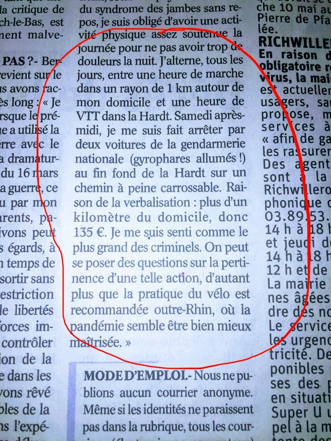 Hier, j’ai fait cinq tours de quartier les plus resserrés qu’on puisse. Ce matin, je les regrette presque tellement les « promeneurs » ont été stigmatisés toute la journée sur les réseaux sociaux. La liste Facebook des Cent Cols est aussi atteinte. S’interroger sur le bien-fondé de l’interdiction du vélo à la campagne est devenu un sujet hautement subversif. Les garde-chiourme de la pensée unique se sont mis à aboyer pour nous faire taire comme si l’on n’avait pas le droit de douter de la justesse des mesures prises en haut-lieu pour juguler l’épidémie.