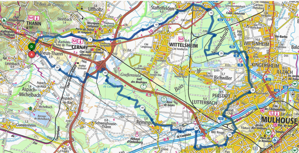 Puis c’est le retour, je passe à Morschwiller sous la quatre voies et je rejoins Lutterbach. Ensuite Reiningue et la forêt jusqu’aux étangs de Cernay