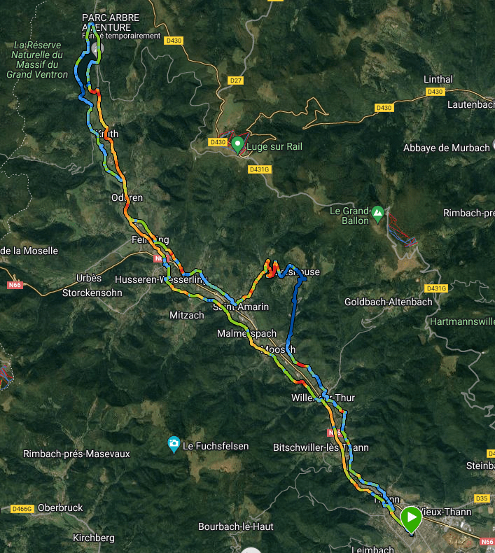 La route du Haag est en bleu, en rouge ma descente du Grand Ballon par Goldbach