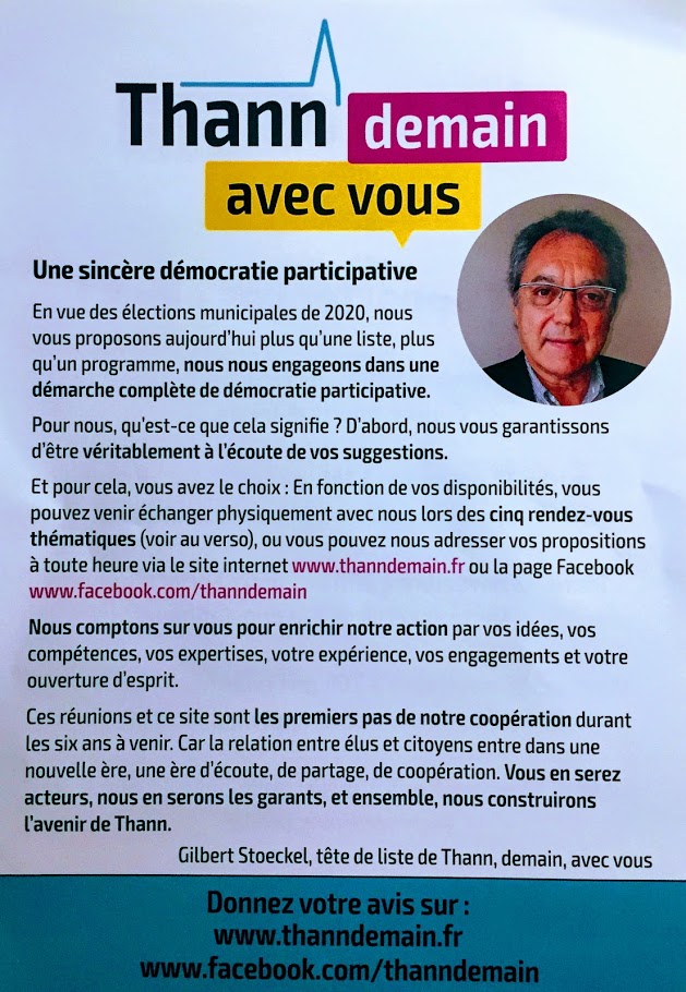 Alors la liste Thann demain, si j’ai bien compris n’est autre que la liste sortante de la précédente mandature amputée de son maire. Menée par le premier adjoint Gilbert Stoeckel, la liste Thann Demain joue la transparence, elle nous invite à venir échanger physiquement lors de cinq rendez-vous thématiques autour de thèmes choisis.