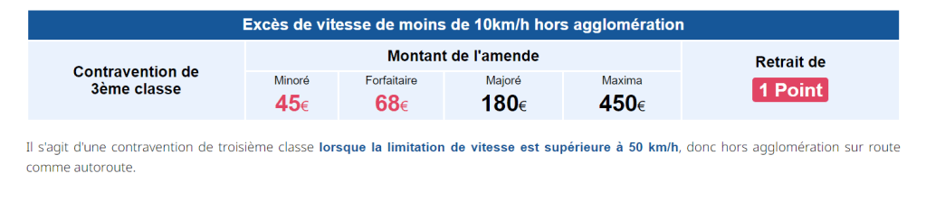 Effectivement, un excès de vitesse de moins de 20 km/h hors agglomération relève d’une contravention de 3eme classe, c’est à dire 68 euros (minorée à 45€).