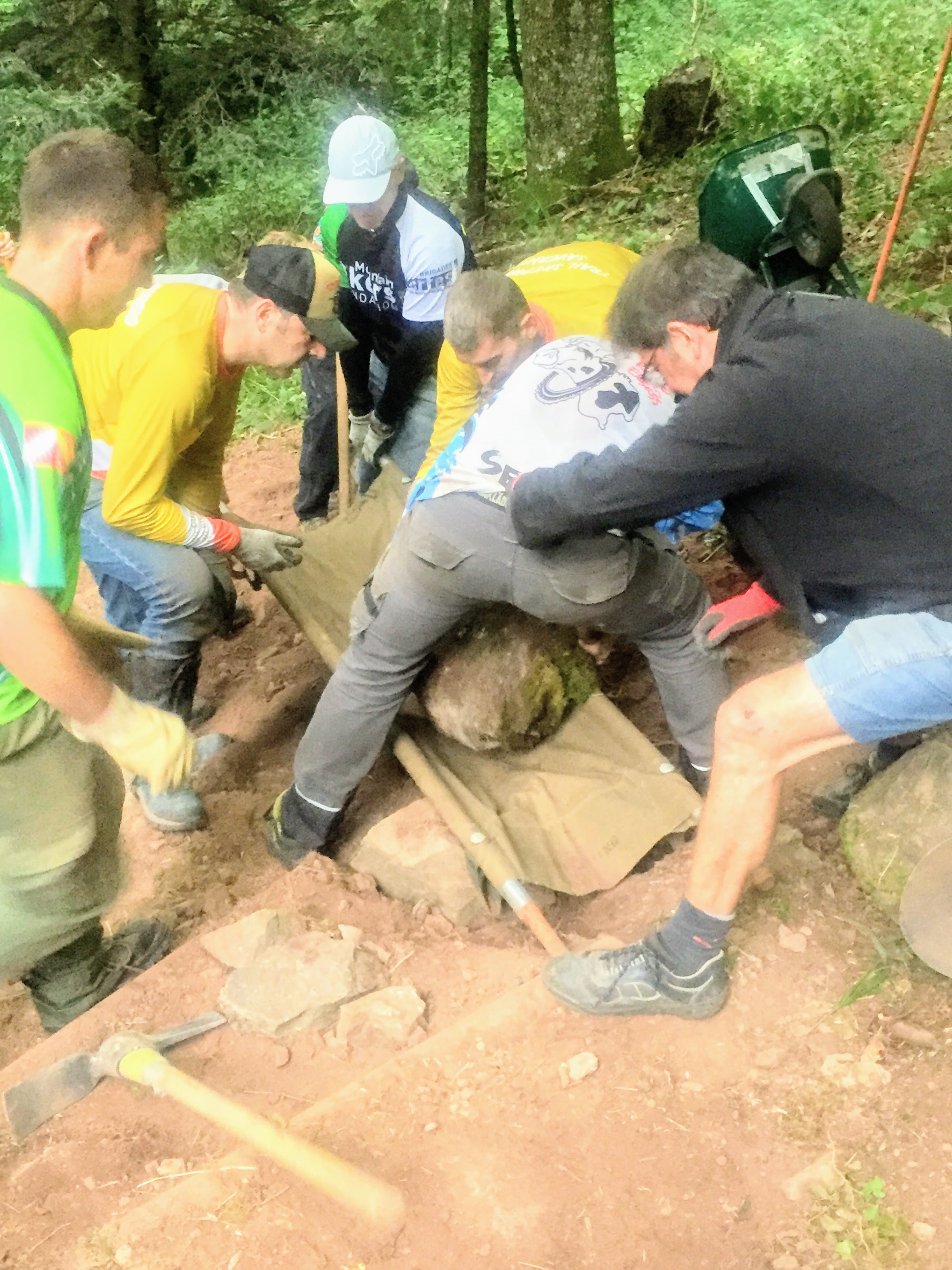 Distribution des rôles au col du Herrenfluh par Arnaud Masson et Christian SchottAu moins 50 participants pressés d’en découdreDécouverte du chantier 1. Il s’agit de créer une trace dédiée aux VTT sur au moins quinze mètres de long et de restaurer des marches en parallèleUne équipe de 10 participants se mettant à défricherconsolidation de la nouvelle emprise à l’aide de troncl’aménagement prend tournure, des cailloux calés le long des troncs doivent permettent l’écoulement des eaux de ruissellement sur le versantconcertation avant finitionLle chantier 3 a fait appel à des moyens lourds. Des blocs ont été apportés sur une civière de chantier afin de structurer une courbe élargie mise en place des blocsSous l’œil de la camera de FR3les marcheurs vont disposer d’escaliers neufsaprès le damage des blocs, ratissage de la terre de jointoiementUne fois terminé, le travail rendu est du plus bel effet, à gauche les marches, à droite la piste à vélo